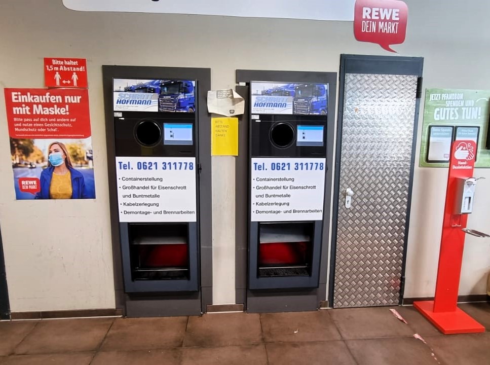 Werbung an Leergutautomaten im REWE Rodriguez in Bürstadt